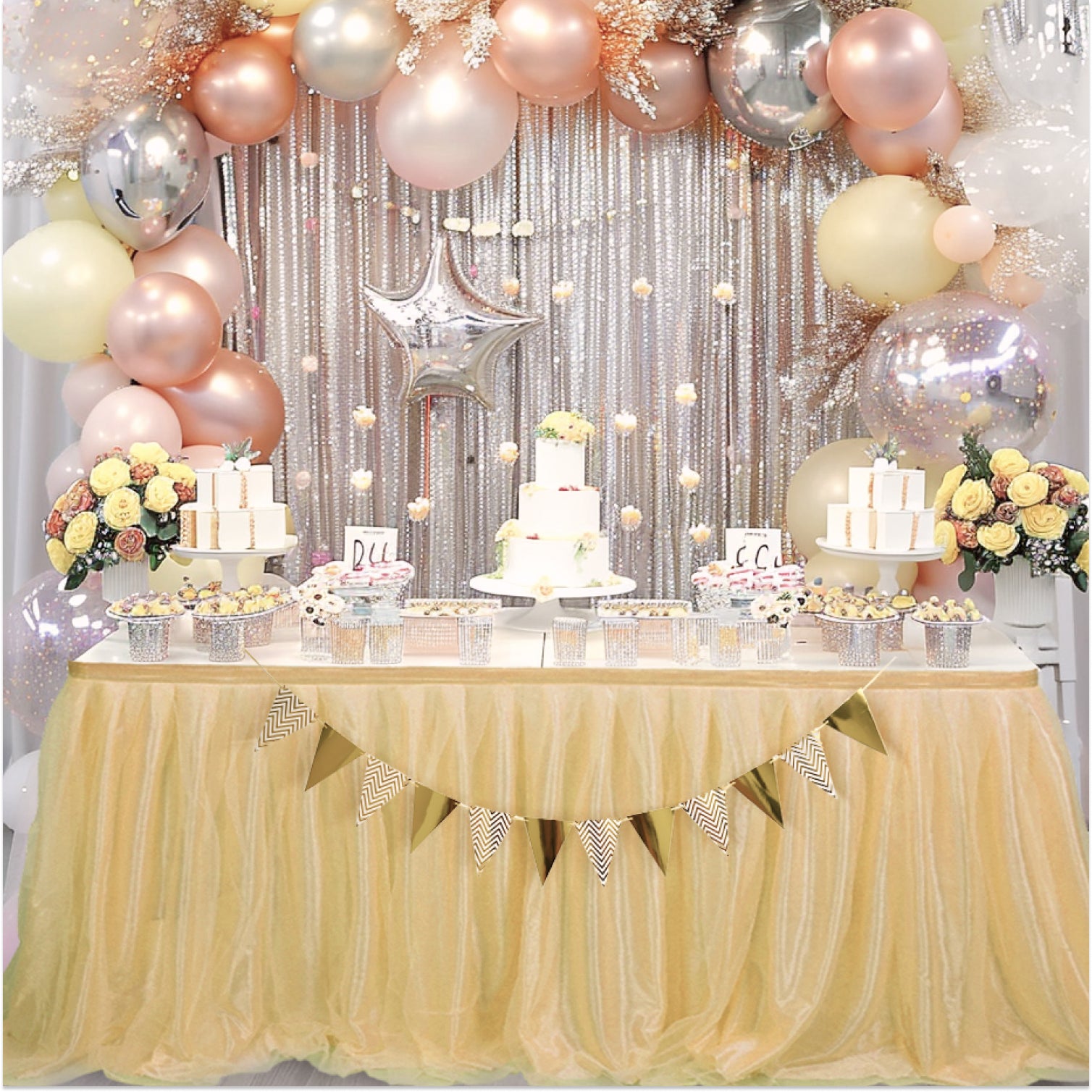 6ft Tulle Table Skirt with Triangle Banner – Gold Ruffle Tulle Tablecloth